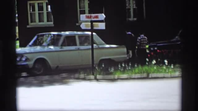 > 1969: two cars are moving one by one and a couple send off the cars from their house. HOLLAND MICHIG