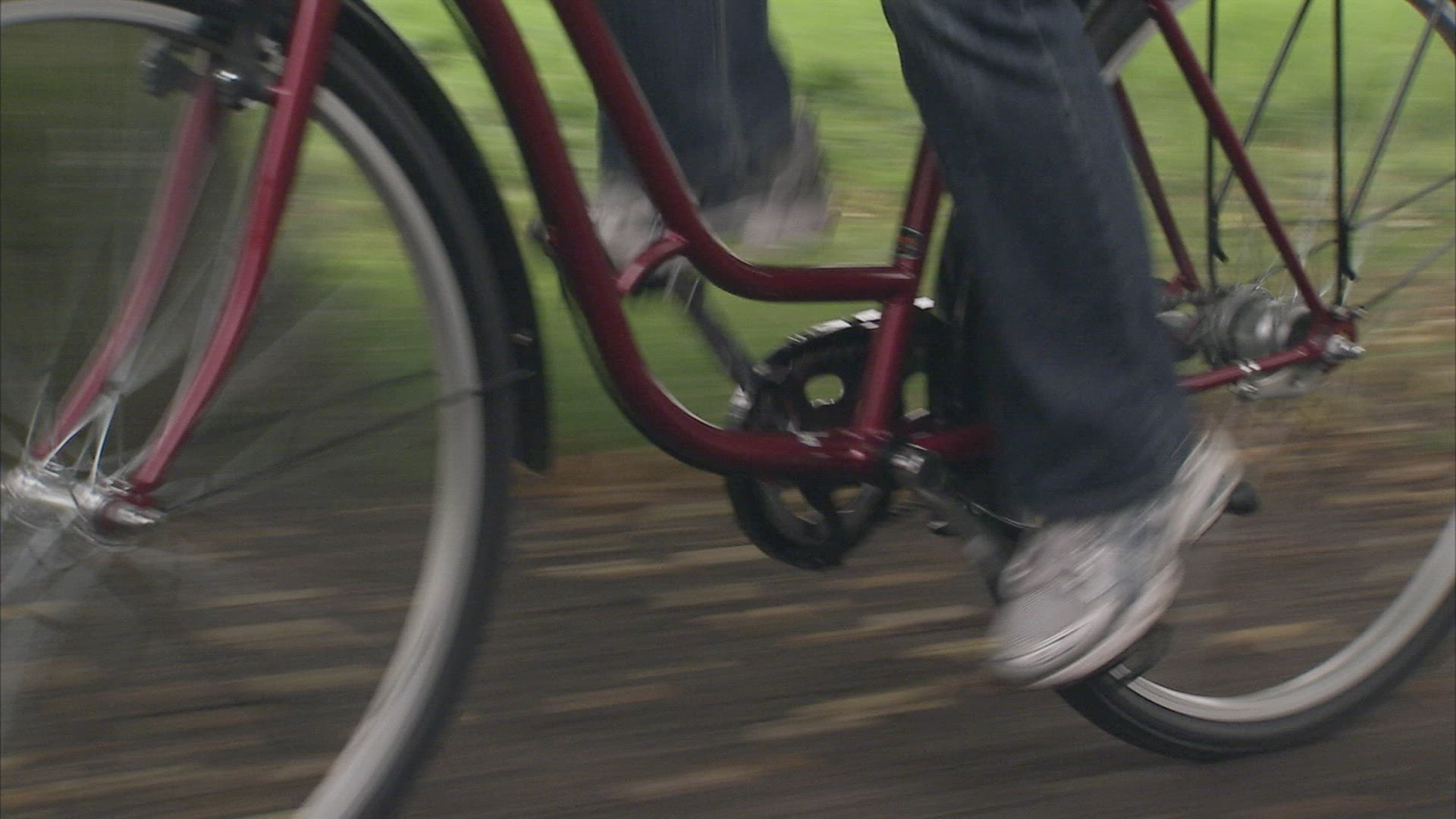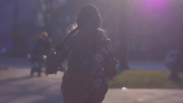 Girl is Riding on a Bicycle on the Background of a Many-Storeyed Buildings. Beautiful Rising Sun is Visible Behind Her Back. the Girl Walks With a Mum in a Centre of City Park. a Few Passers-By Pass by Them. This Video Was Filmed in a Super Slow-Motion Mode.