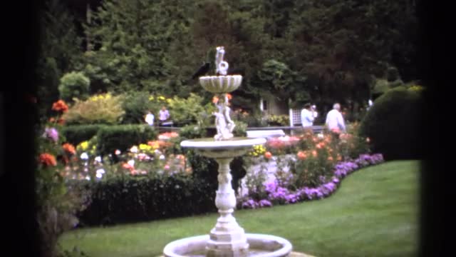 > 1974: beautiful fountain surrounded by flowers and tourist taking pictures VANCOUVER CANADA