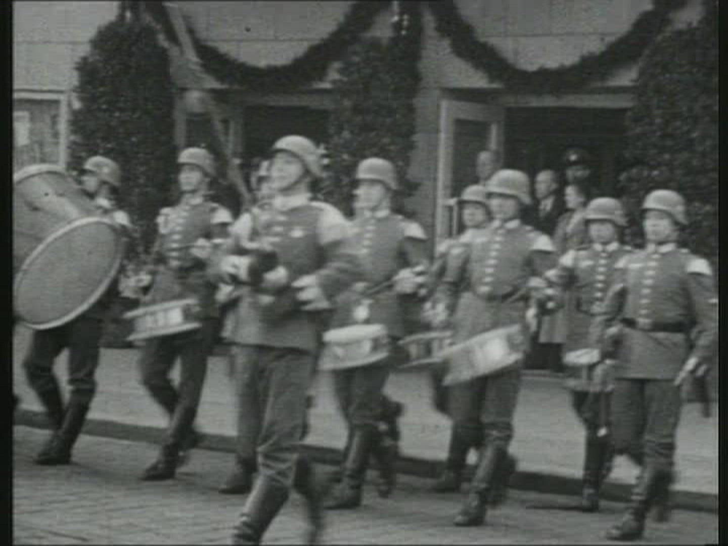 > 1967: english marching band parading on front an old building, OTTAWA CANADA