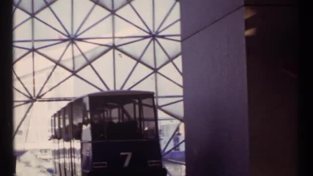 > 1967: a train trolley rounds a track with visitors on board MONTREAL CANADA