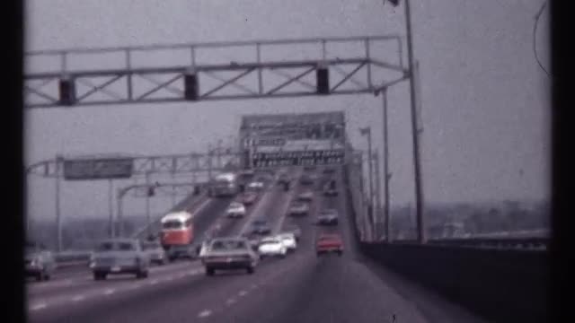 > 1967: busy traffic heading up the bridge to get over the water. there is a steep incline to do so. M