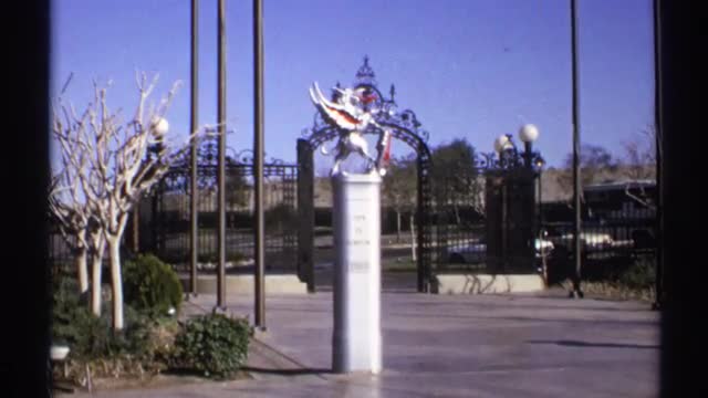 > 1972: an iron gate entrance is flanked by poles and a column with a sculpture atop it ARIZONA