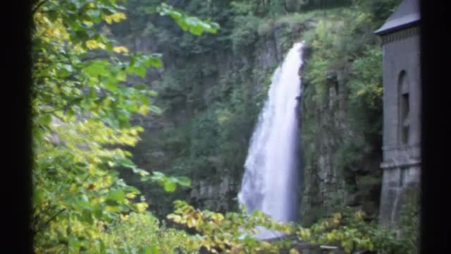 1971: rushing waterfall on the side of a cliff, next to an old building surrounded by greenery NEW Y
