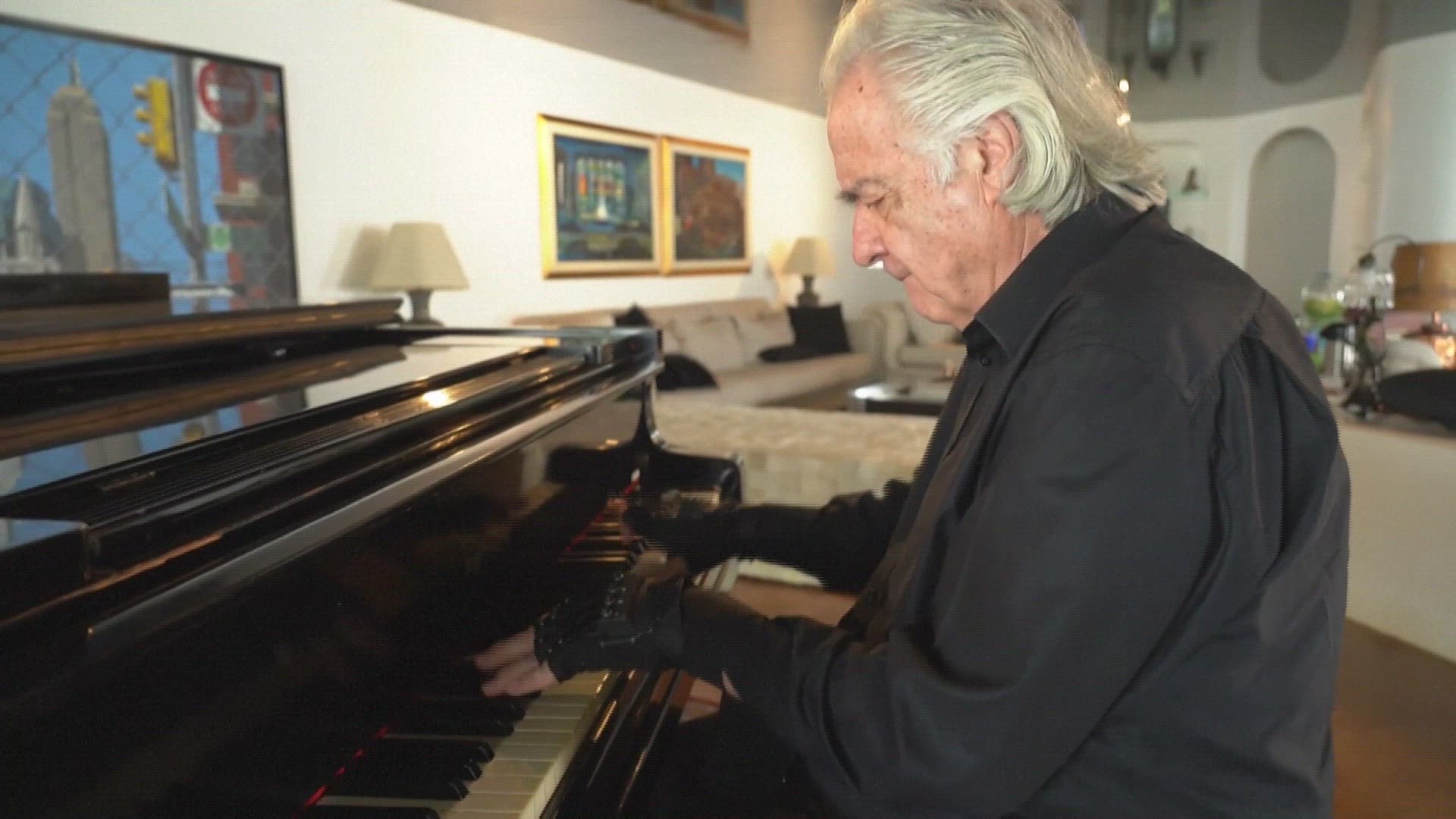 > 1972: elderly man playing piano outside ISLE ROYALE MICHIGAN