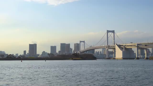 > View of Rainbow bridge and Tokyo cityscape from Odaiba on a Winter day, Tokyo, Japan