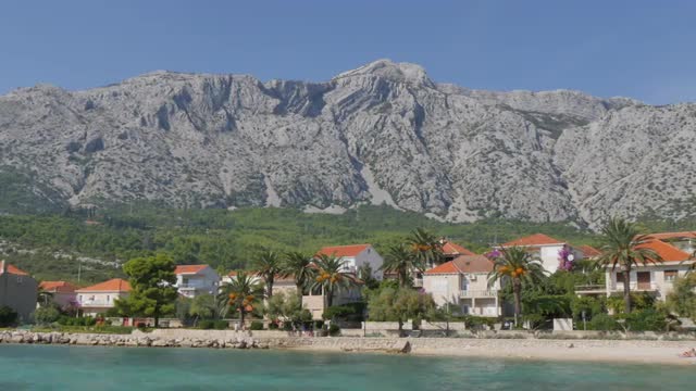 Aerial scene with drone traveling through rocky coast at Croatia. Virgin island. Transparent water. Camera travels on top of rocks, at the beginning from above, panoramic view to detail shore.