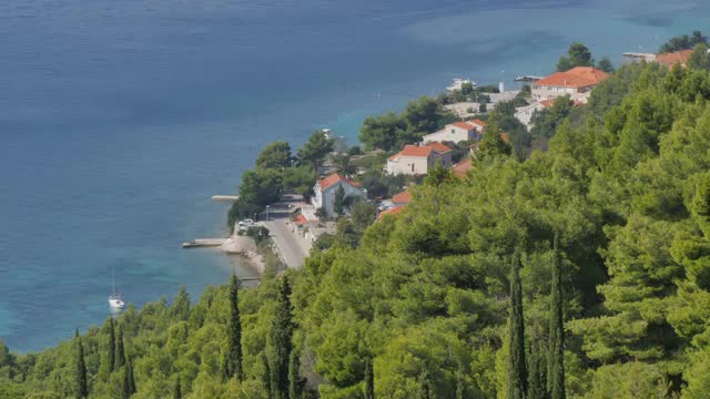 Aerial scene with drone traveling through rocky coast at Croatia. Virgin island. Transparent water.