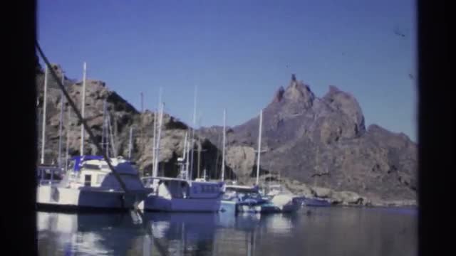 > 1975: boats on steady water with a rocky mountain scene in the background. GUAYMAS MEXICO