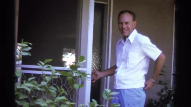 > 1974: a man talk with some other and opened his house and laugh with the person at morning and trees
