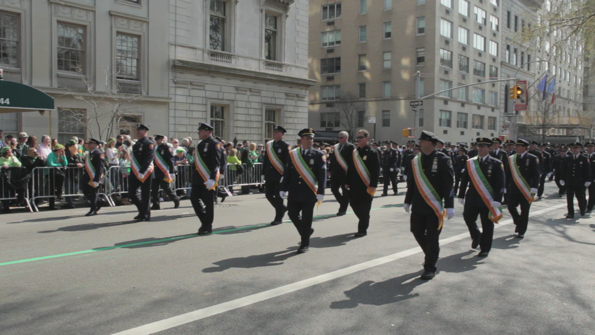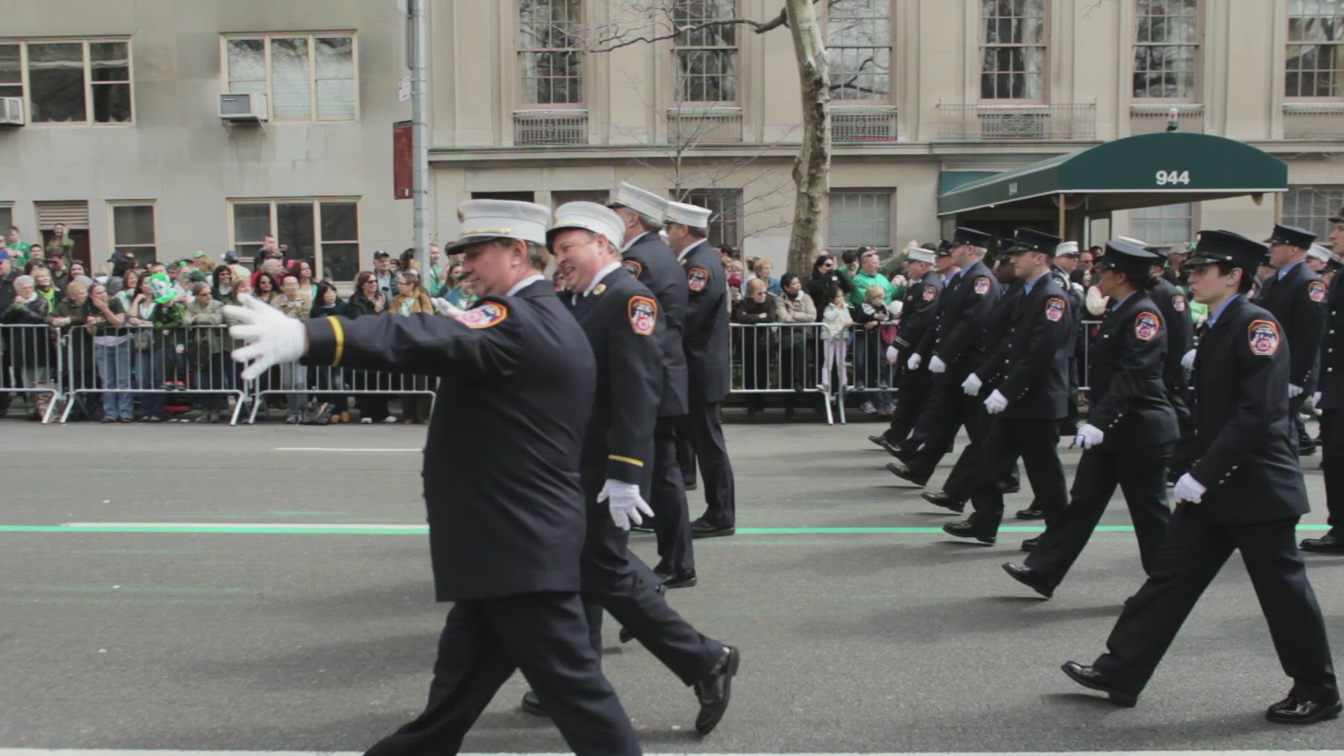 > 1937: a parade being led by police officers on horseback. they are being followed by men in kilts. C
