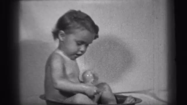 > 1938: a little boy at home and taking his toy at the bathtub and doing brush to him and his toy like