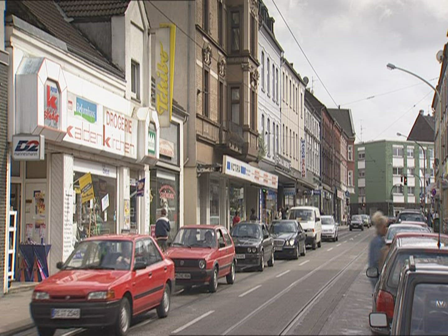 > 1957: woman pushing a baby carriage while crossing a street ENGLAND