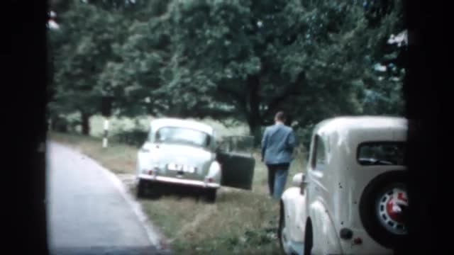 > 1957: two cars parked on the grass by the side of the road, with one of the drivers waiting around E