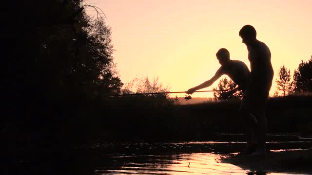 Silhouettes of Adolescents Catching Fish in a River on a Sunset Background