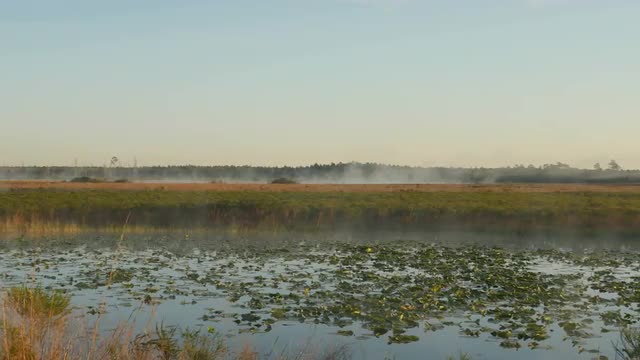 Forest River in the Fog in the Summer Early Morning. Grass in the Dew.scattered Backlight