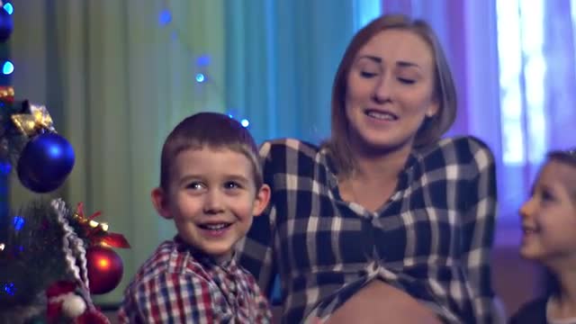 Portrait of Cheerful Girl With Medium-Length Blond Hair and Dark Red Lipstick on Lips, Which Rejoices and Rejoices, Laughs and Swings Hands, Hums Melody or Sings Song and Lies on Floor Covered in Plaid in Pink Sweater With Long Sleeves on Background of Wall With Glowing Yellow Garland and Near New Year Tree in Dark Cozy Room. Concept of Festive Mood and New Year's Bustle, Desired Gifts For New Year or Christmas, Happy Beautiful People and Fulfillment of Desired Dreams, Holiday Attributes and Symbols.