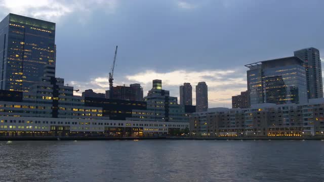 > Night view of False Creek with illuminated Science World