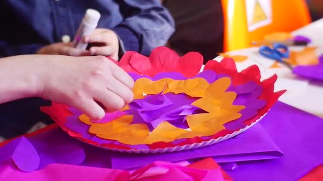 Opole/poland - Feb 11 2017: Children Create a Beautiful Multi-Coloured Decorations by a Holiday. They Are in a Premise of Library of a City of Opole (Poland). Children Create Decorations From a Bright Colour Paper. Adults Help Them With This Occupation. Video Was Filmed During Celebration of a Valentine's Day. Video is in a Super Slow Motion Mode.