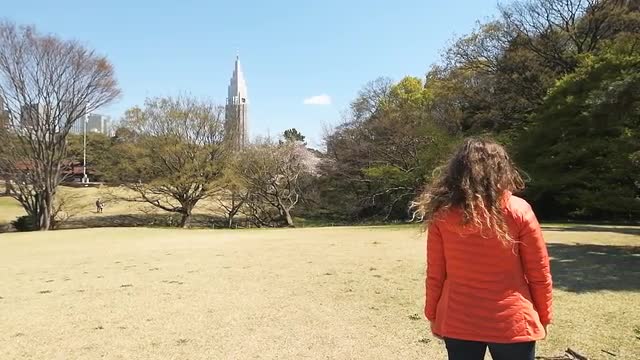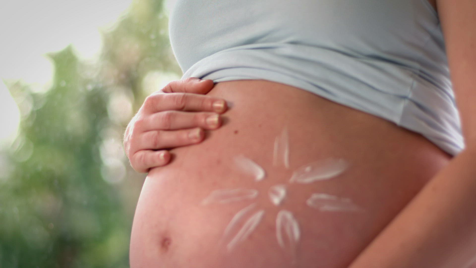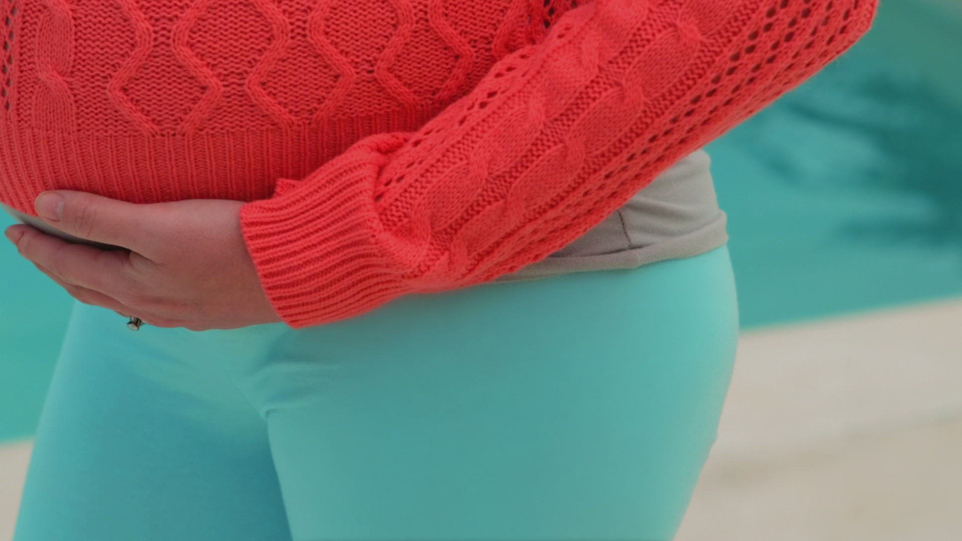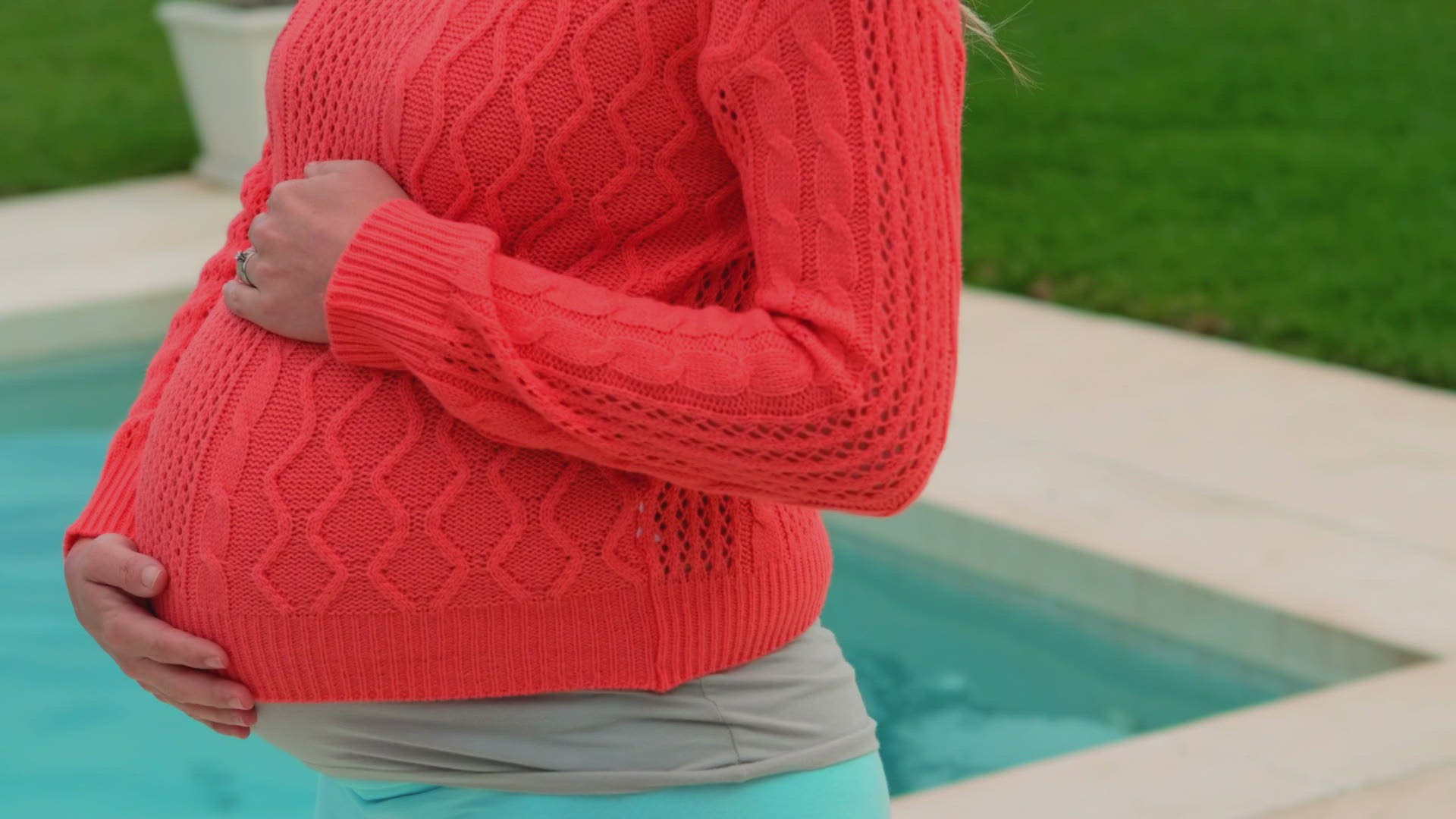 Woman Who is Waiting For Baby is in Field Looking For Someone or Something. She Touch Her Belly Very Gental. Enjoying the Weather. She Stands in High Grass Near Green Trees. Blue Sky With Clouds.