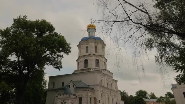 Man Enters Ancient Building of Chernihiv Collegium, Old School and Its Courtyard, Lush Beautiful Park is Around the Building. Golden Dome on a Top of Bell-Tower. Tourism in Ukraine, Historical Building of Ancient Chernihiv, Architectural Heritage of Ukraine Built Close to Transfiguration Cathedral and Boris and Gleb Cathedral. Ukrainian Baroque, Cossack Baroque or Mazepa Baroque Style. Cloudy Springtime Day in Park. Religious Building on a Background of Heavy Stormy Clouds. Nice Walk Outdoors. Traditional Religion in Ukraine. Summer Landscape