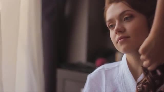 Young Bride Make-Up Artist Prepares For Wedding. Her Face Applied to Face With Large Fluffy Brush. Girl Does Not Move and Looks Thoughtfully Forward. Her Red Hair Made Into Wavy Hairstyle Slow Motion