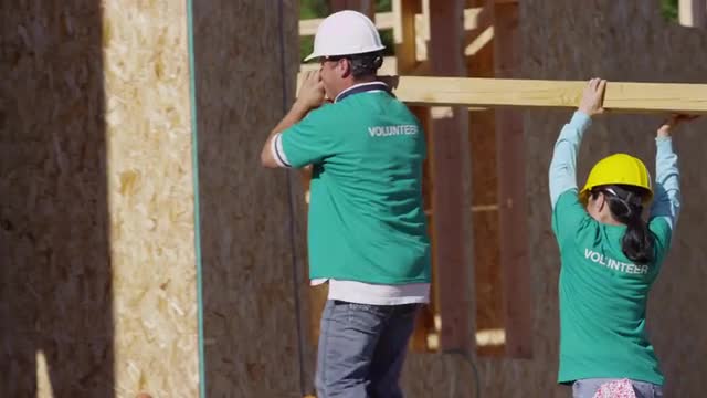 381806 - Volunteers working together carrying lumber