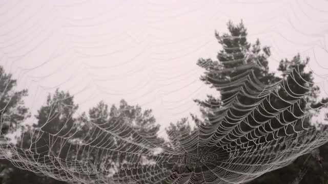 Large Cobweb in Droplets of Dew Against Background of a Misty Forest