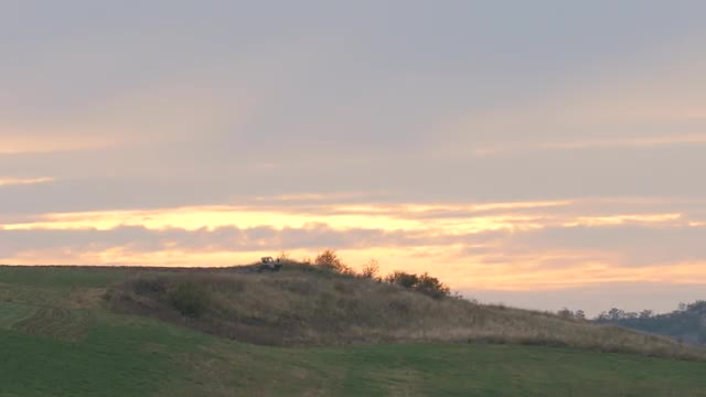 Agriculture, the Vehicle Plows the Ground in Autumn on the Open Space After Harvesting, Beautiful Evening Landscape. Ukrainian Steppe, Unforgettable Walk by Field. Farm Vehicle, Tractor Are Riding by Field on a Background of Sunset Sky. Blue and Orange Sky, Bright Colorful Sky, Dusk, Trees and Hills Silhouettes. Evening Countryside