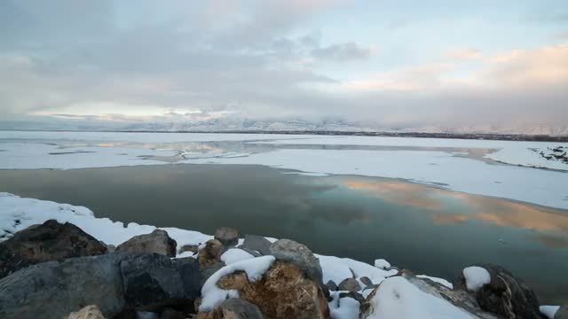 Panning time lapse over frozen lake with snow at sunset