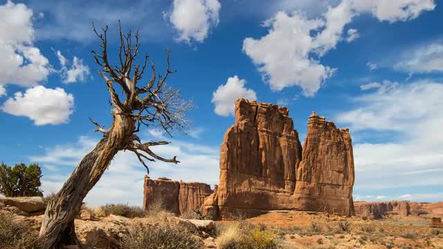 Cloudy time lapse of the Courthouse and small tree in Arches NP Utah