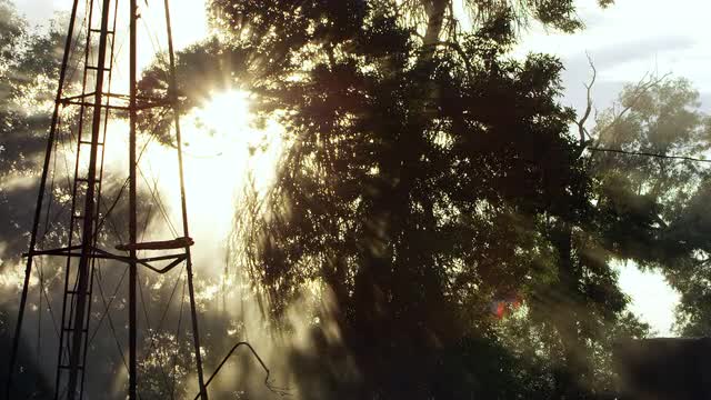 Sun shining through trees and smoke from house fire