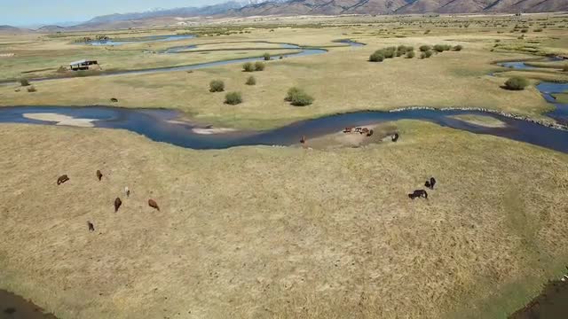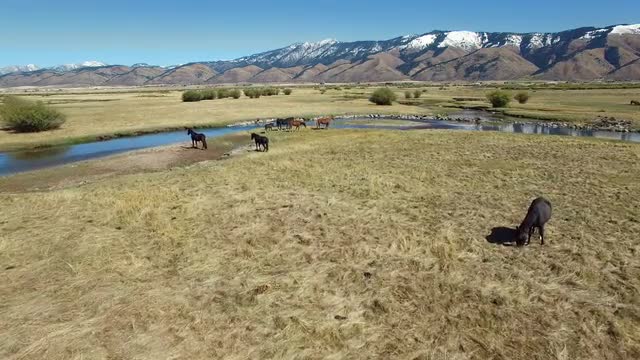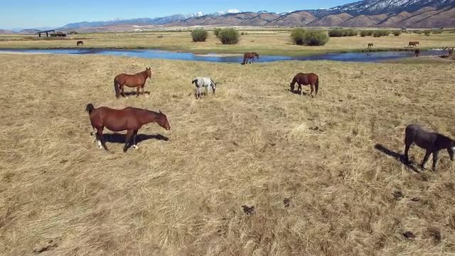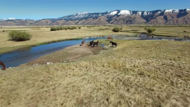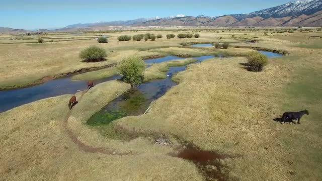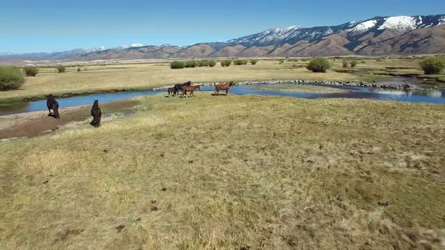An aerial view of drone crossing river, while horses run in the background.
