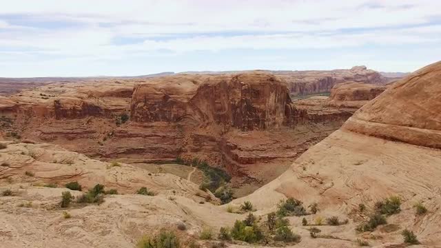 Drone flying over a red rock summit, with a hiker on summit, with valley below.