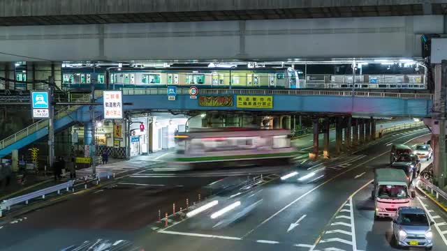 Timelapse of a busy street in Tokyo at night with people crossing and traffic.