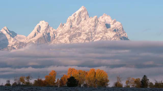 Static view of the Grand Tetons as the sun rises and lights up the tree during Fall.