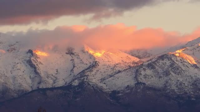 Panning view of icy landscape during bright colorful sunset on Utah Lake.