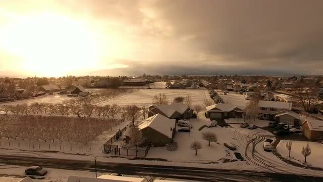 Aerial pan of sunset at snow is falling while flying over neighborhood.
