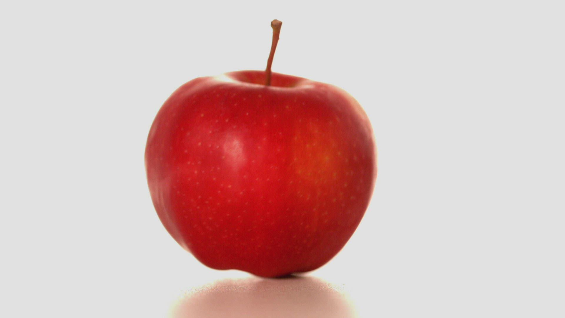 A cute little girl eating a fresh apple in the park and showing big finger up.
