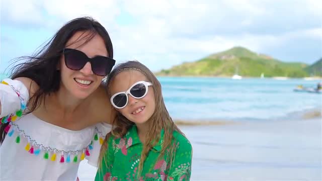 Attractive mother and cute little daughter having fun and doing selfie in the pakk at sunset