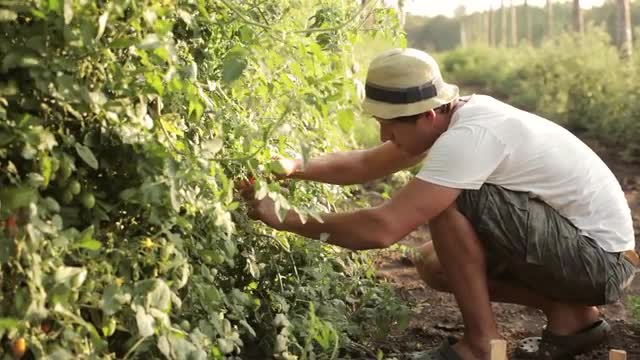 740612 - Farmer picking a cherry tomatoes on organic farm