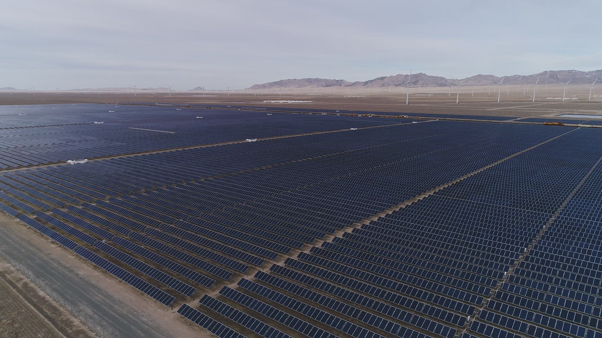 2125882 - Flying over road parallel with solar farm in the Utah desert
