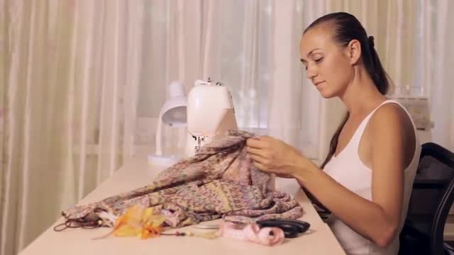 Young woman sews on the sewing machine