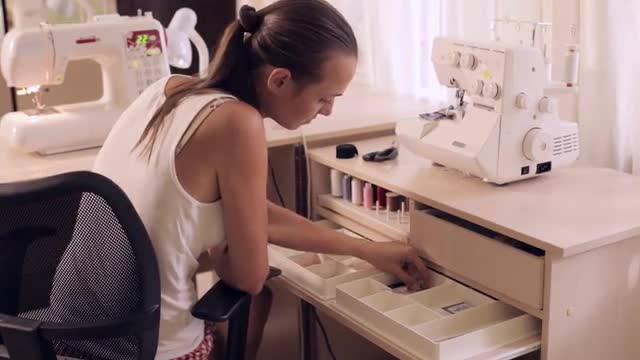 Young woman sews on the sewing machine