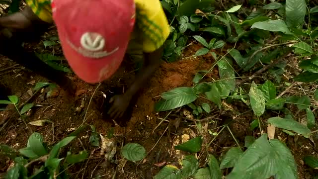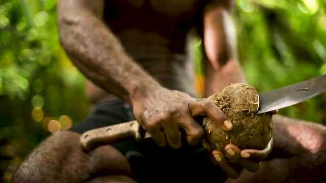 > Indigenous man's hands chopping a coconut chunk with machete, high speed closeup