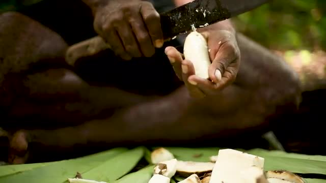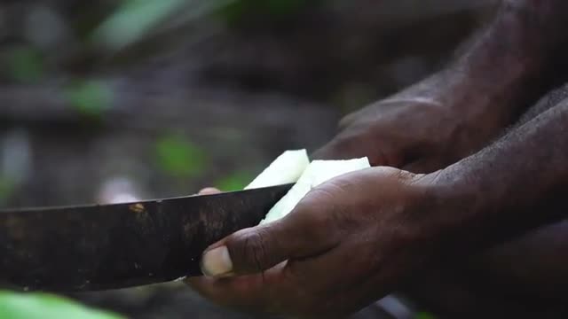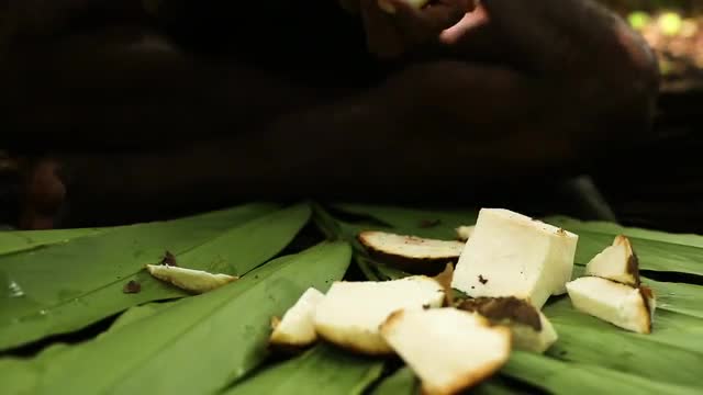Indigenous man's hands chopping a coconut chunk with machete, high speed closeup