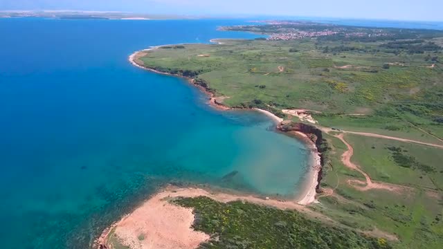 This aerial video introduces a sea landscape with small islands, lagoons, rocky coastlines, sandy beaches with boats surrounded by turquoise crystal clear water.