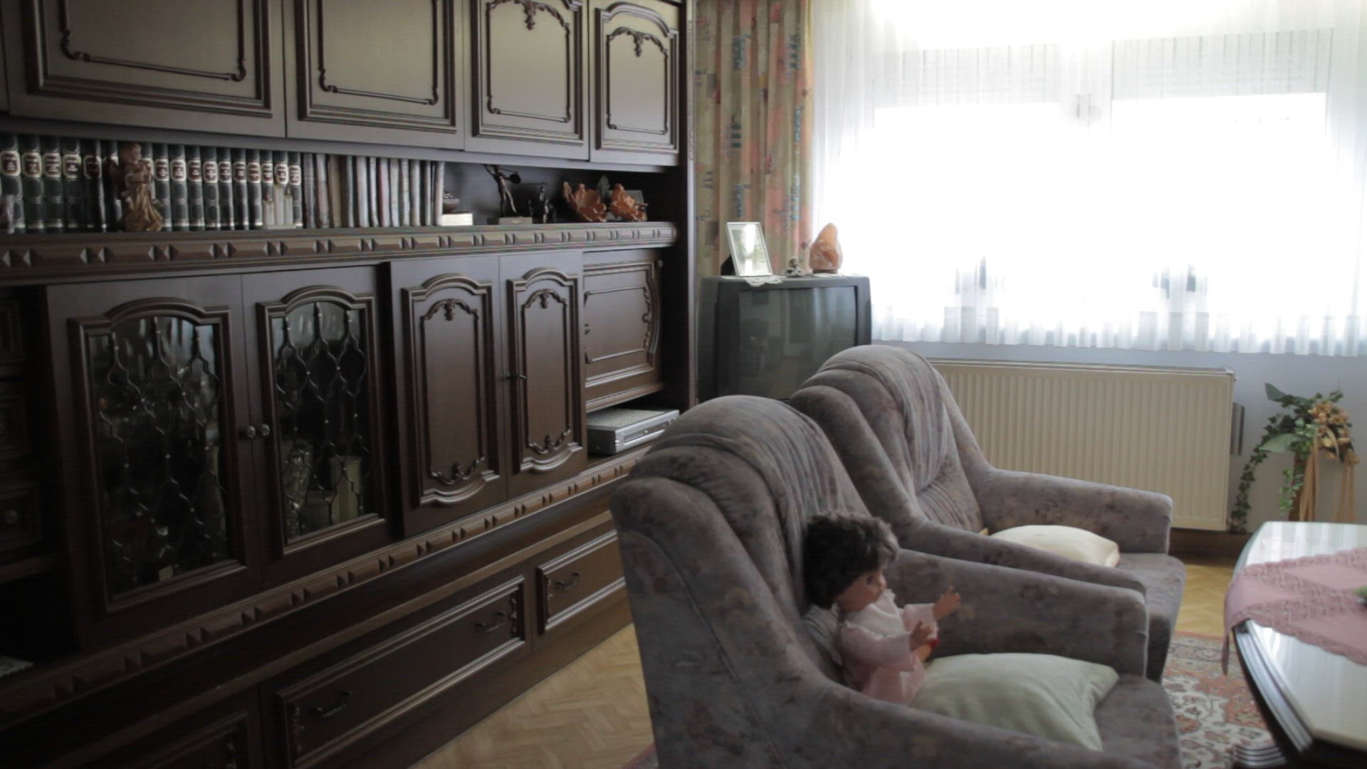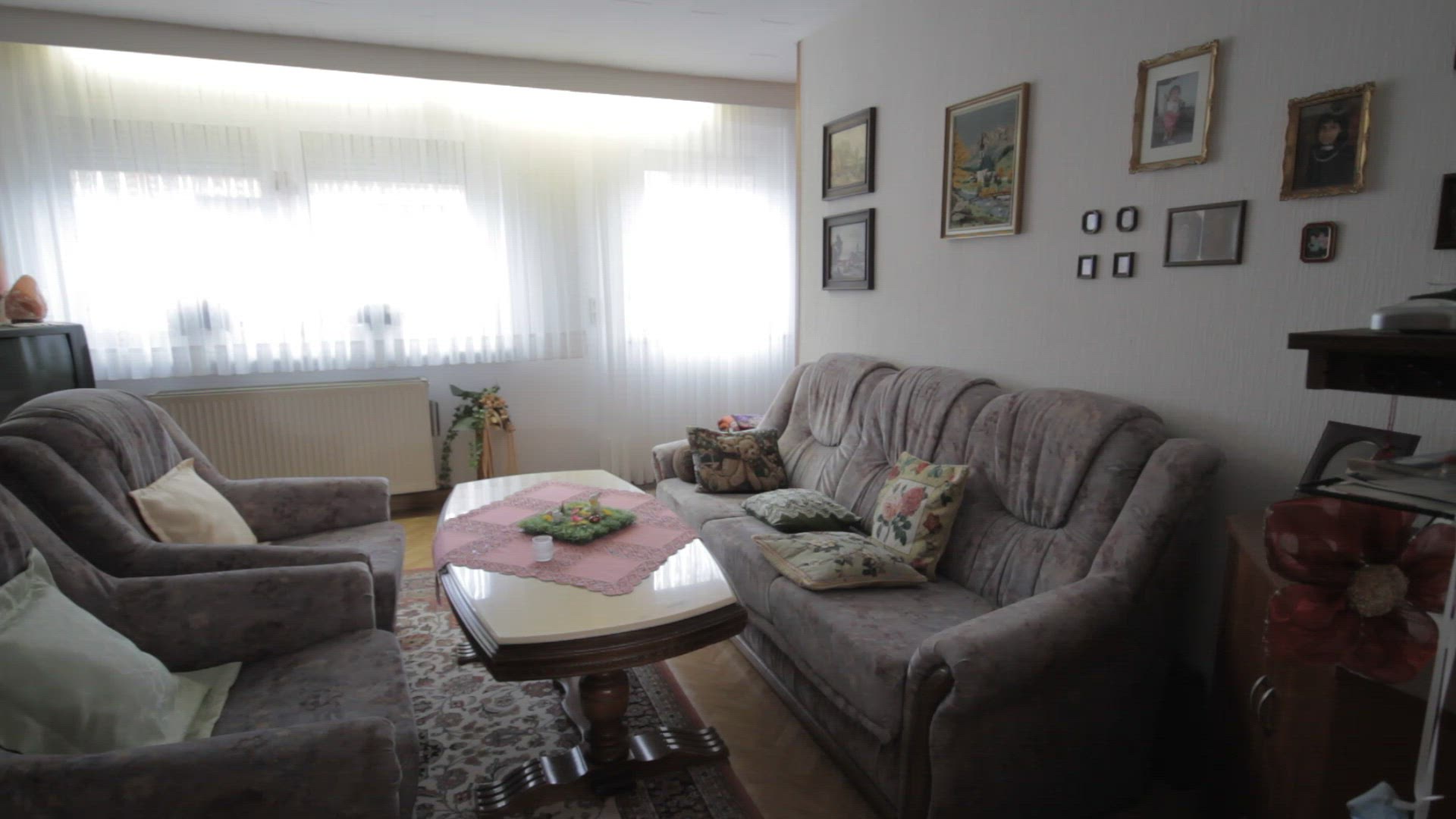 Light-Room Interior Decoration by a Designer. in the Center is a Small Table With a Tablecloth. on the Table There Are a Cup of a Cup and a Basket With Sweets. Next to the Table Are a Candlestick. Photo Frame and a Clock. Around There Are a Few Light Pillows. Slow Motion