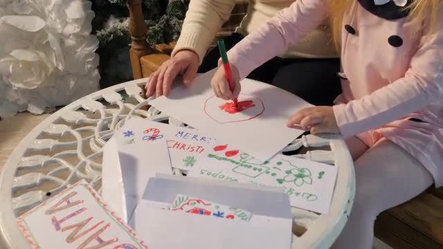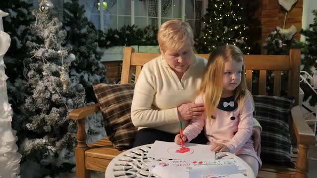Grandmother and Kid Are Sitting at the Table Close Up, Family Stays Home. Grandma and Granddaughter, Cute Little Blonde Girl, Are Drawing Together. Granny Convinces the Girl in Santa Claus Existing, People Are Writing a Letter to Him. Traditional Celebration of New Year, Fairy Tales, Traditional Attributes of the Holiday in Western Europe. Christmas Decoration is on Background, Modern New Year Interior, Cosy Room With a Large Window, Evening, Christmas Eve. Lights Are Sparking, Soft Light. New Year Trees Are Installed. Holiday With Granny, Childhood, Wintery Vacation. Well-Dressed People Are Waiting For the Party.
