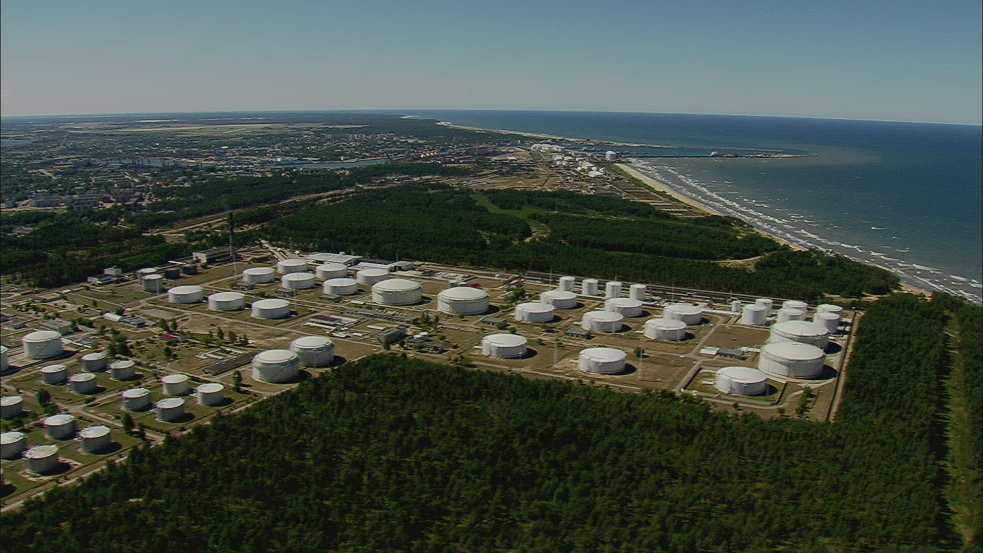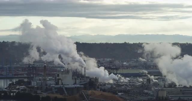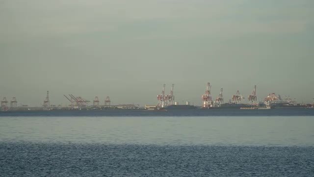 Slow motion shot of a flock of seagulls over the industrial port over gray sky